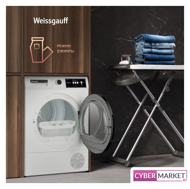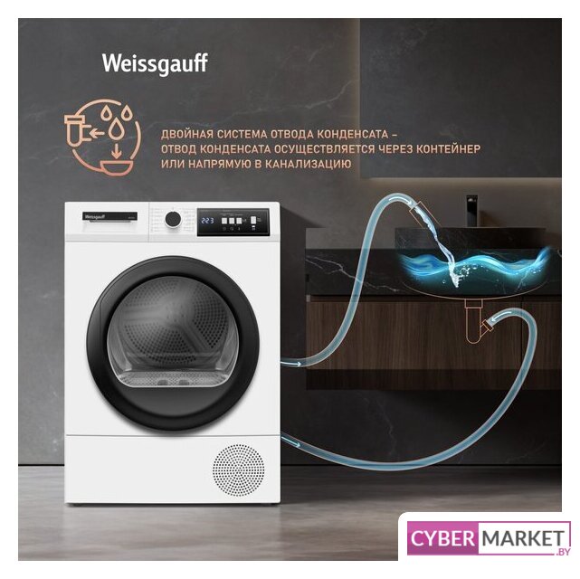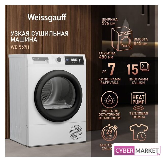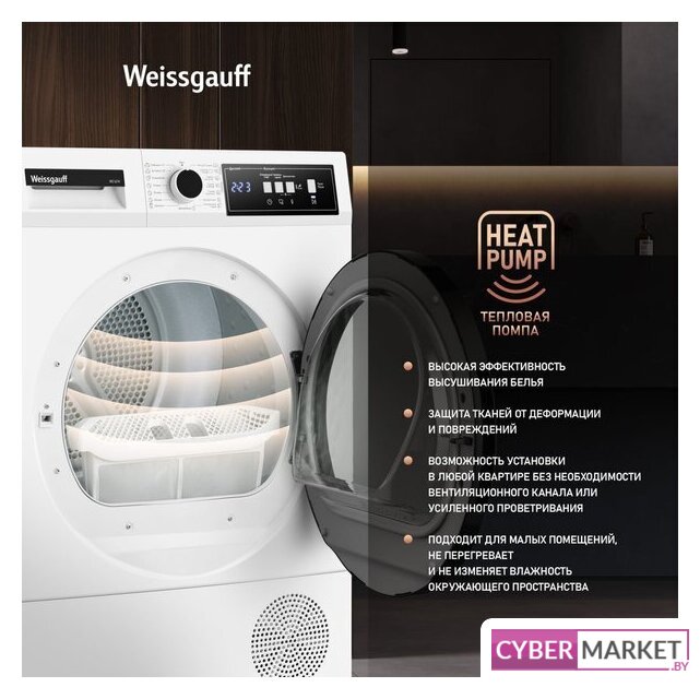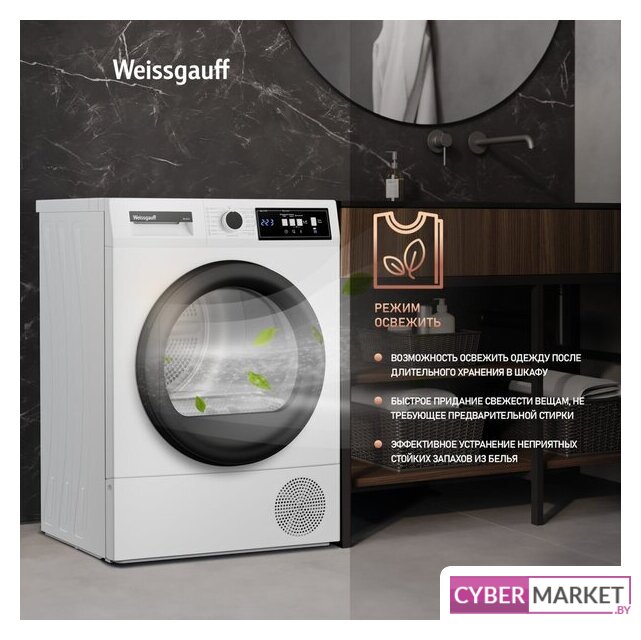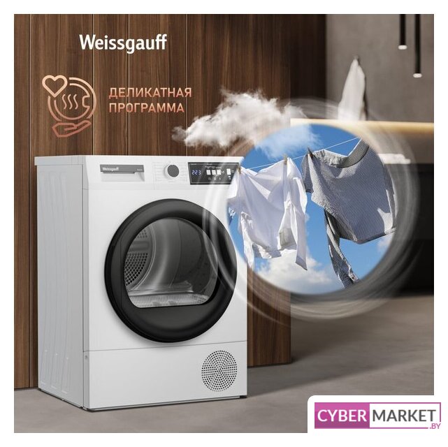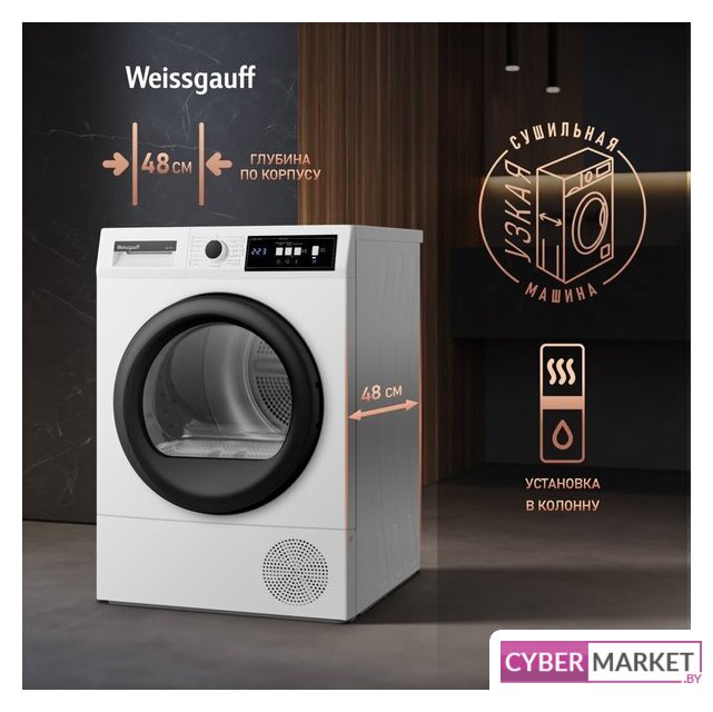 отдельностоящая, сушильная машина, сушка: конденсация с тепловым насосом, с паром, загрузка до 9 кг, глубина 60.5 см, 15 программ