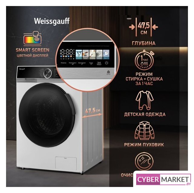 | Оригинальные функции | увеличенный цветной дисплей SMART SCREEN с сенсорным управлением; функция дозагрузки белья; программа для пуховика; очистка барабана |