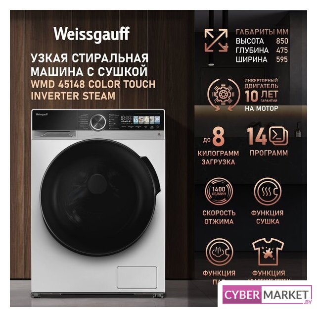 отдельностоящая, стирально-сушильная машина, с паром, загрузка до 8 кг, отжим 1200 об/мин, глубина 43 см (с люком 52 см), энергопотребление A+++, прямой привод, 11 программ