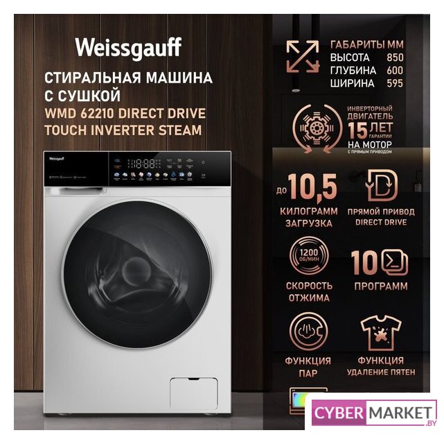 отдельностоящая, стирально-сушильная машина, с паром, загрузка до 10 кг, отжим 1400 об/мин, глубина 48.7 см (с люком 57.7 см), энергопотребление A+++, прямой привод, 11 программ