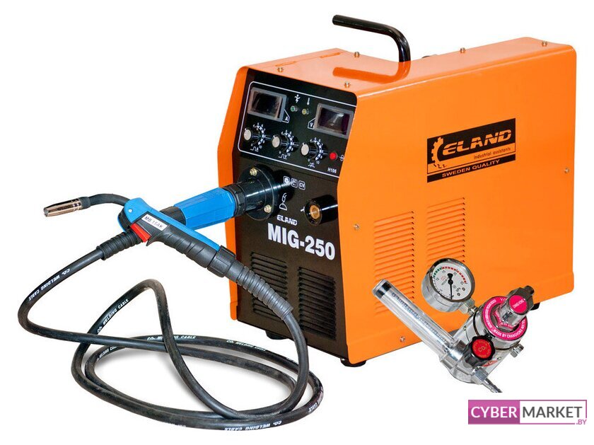 ручная дуговая сварка (MMA)/полуавтоматическая сварка (MIG MAG), 380 В, сварочный ток: 40–250 А, диаметр электрода: 0.8–1 мм, 23 кг