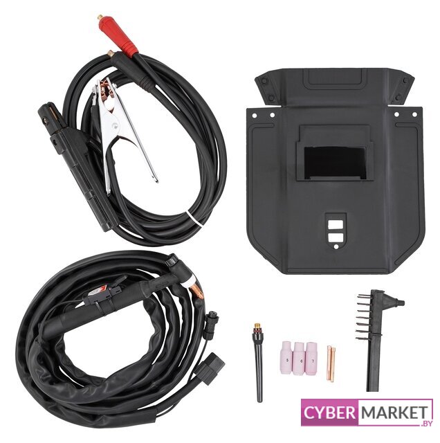 | Комплект поставки | Cварочный щиток, молоток-щетка, TIG горелка 3,1 м., держатель электрода ММА 2 м., кабель заземления 1,6 м., кабель питания 1,75 м., 3 сменных керамических сопла (№4,5,6) и 2 наконечника для сопла TIG горелки, защитный колпачок для вольфрамового электрода. |
