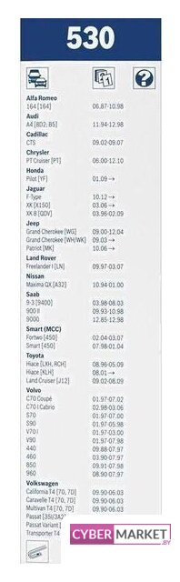 щетки стеклоочистителя, каркасная, крепление спереди, вид крепления: Hook (крючок), 530 мм/450 мм