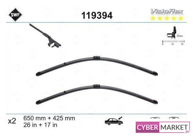 щетки стеклоочистителя, бескаркасная, крепление спереди, вид крепления: Side Mounting, 650 мм/550 мм